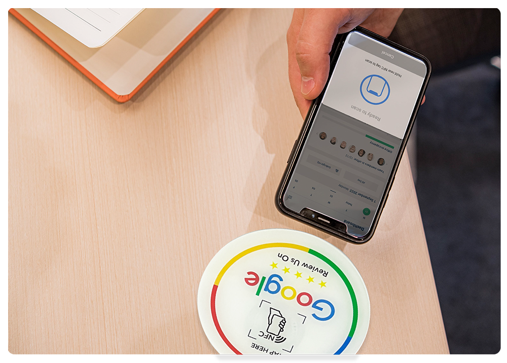 A stylish NFC stand for restaurants, salons, or clinics. Tap-to-review or tap-to-check-in features increase foot traffic interaction and help collect real-time feedback effortlessly. .